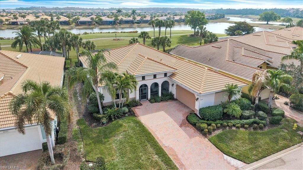 This exquisite home is situated in the award-winning Pelican Preserve community, featuring the stunning Correggio floor plan in the coveted Azzurra neighborhood. It overlooks the golf course with water views beyond. The property offers a spacious paved lanai, perfect for enjoying morning sunrises and sipping coffee. The saltwater pool and spa with waterfall and new equipment in 2021, creating a luxurious outdoor oasis. Additionally, there is a convenient half bath on the lanai and plumbing for a...This exquisite home is situated in the award-winning Pelican Preserve community, featuring the stunning Correggio floor plan in the coveted Azzurra neighborhood. It overlooks the golf course with water views beyond. The property offers a spacious paved lanai, perfect for enjoying morning sunrises and sipping coffee. The saltwater pool and spa with waterfall and new equipment in 2021, creating a luxurious outdoor oasis. Additionally, there is a convenient half bath on the lanai and plumbing for an outdoor kitchen. Electric shutters adorn the lanai and front of the home, while accordion shutters protect all other windows. The front entry is screened in, adding to the charm and functionality of the property. Inside, high ceilings with crown molding and trays plus attractive fixtures create an elegant atmosphere. The living area features 18 diagonal tile, while the large den boasts French doors and engineered wood flooring. The kitchen has been updated with a granite island and new appliances, including 2 pantries. There is a whole house water filter system for clean and purified water. The AC was replaced in 2019, the water heater in 2018, and the roof has been inspected and deemed to be in excellent condition. The owner's suite includes his and hers counters, a soaking tub, and a large walk-in shower. The garage offers extra space for a golf cart, an extra refrigerator, and shelving for storage. Furniture is negotiable, as well as a 4-seat golf cart with new batteries. Pelican Preserve is a 55+ community known for its amenity-rich lifestyle, offering activities such as tennis, pickleball, fitness classes, dancing, bocce ball, swimming, restaurants, walking trails, a dog park, butterfly garden, softball field, and more. Residents can also enjoy a 27-hole golf course with various membership options. This exceptional property is sure to attract interest, so schedule a viewing today to experience the luxurious lifestyle that Pelican Preserve has to offer.